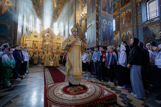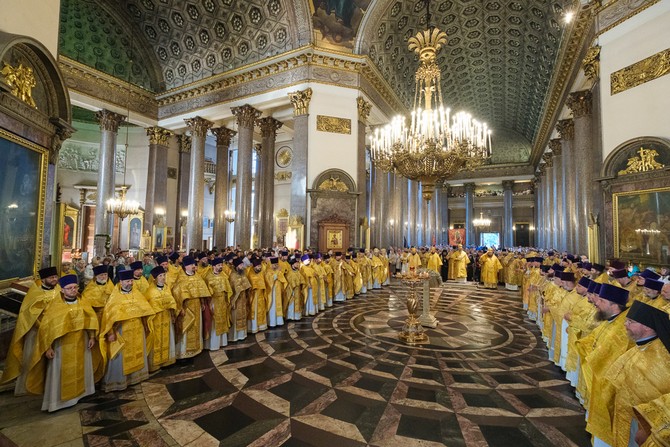 Божественную литургию в Казанском кафедральном соборе совершил епископ Выборгский и Приозерский Варнава в сослужении епископов Гатчинского и Лужского Митрофана, Петергофского Силуана, Сарапульского и Можгинского Павла, Нефтекамского и Белебеевского Митрофана, клира собора, духовенства митрополии.