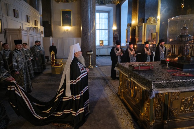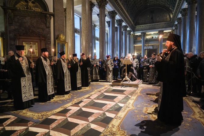 В понедельник 1-й седмицы Великого поста, 23 февраля, митрополит Варсонофий молился за уставным богослужением в Казанском кафедральном соборе — утреней, часами, изобразительными и вечерней, — которое совершил протоиерей Андрей Герасимов. Уставные тексты читали клирики собора. В тот же день правящий архиерей совершил в соборе великое повечерие с чтением канона преподобного Андрея Критского. Его Высокопреосвященству сослужили секретарь епархиального управления Выборгской епархии протоиерей Игорь Аксенов, ключарь протоиерей Андрей Герасимов, председатель приходского совета протоиерей Александр Пашков, клир собора и другие священнослужители. Пел хор собора под управлением Светланы Румянцевой.