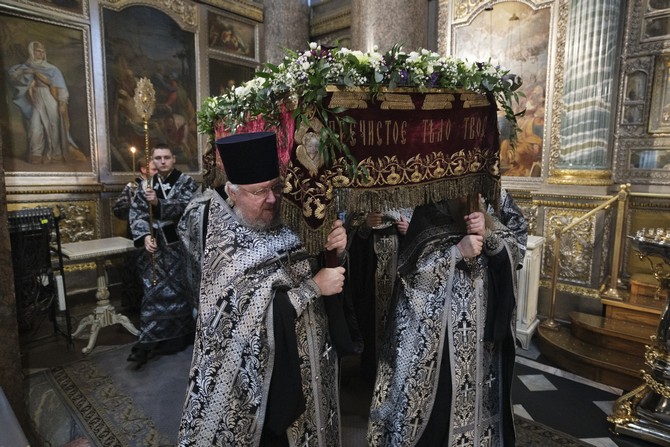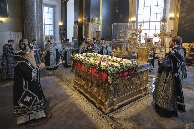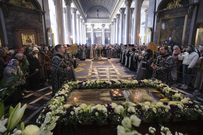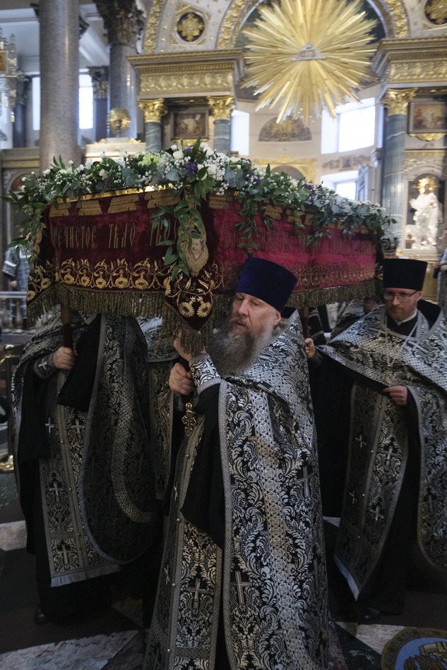 В Великую пятницу, 10 апреля, митрополит Санкт-Петербургский и Ладожский Варсонофий совершил вечерню с чином выноса Плащаницы в Казанском кафедральном соборе. Его Высокопреосвященству сослужили секретарь епархиального управления протоиерей Сергий Куксевич, протоиерей Николай Преображенский, ключарь протоиерей Андрей Герасимов, председатель приходского совета протоиерей Александр Пашков и клирики собора.